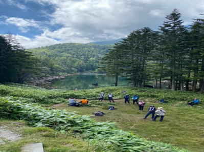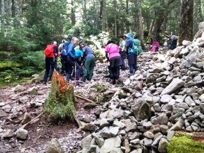 双子池から雨池とめぐりRW利用の2班と合流。昼食の後、雨池峠を越えて北八ヶ岳EW山頂駅まで歩いて池めぐりトレッキングを終える。