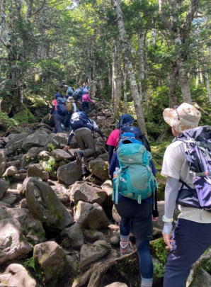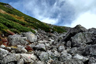 山荘前の広場で一息いれて、いよいよ最後の急登だ。重なる岩を乗り越えながら手足で登る。