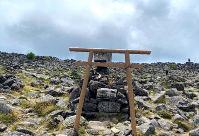 雄山組は岩やガレの急登を喘ぎ登り15時前に山頂へ。幸いお祓い終了直後で最高峰の神社境内に入れて頂きバンザーイ!