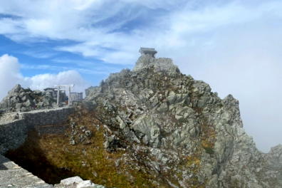 更に急な岩場を登り、山岳修験者の行場だったという巨岩が点在する『七福園』に出ると大日小屋はすぐ。14時過ぎ小屋到着。