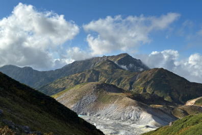室堂平は紅葉の盛り。回復する青空の下、雄大な景色に草紅葉が広がる。