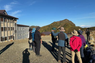 一方、奥大日岳で別れたB班8名は昔の奥大日山頂に立ち寄り寄り、剣岳の凛々しい姿に見とれてから登ってきた道を雷鳥沢へ下る。