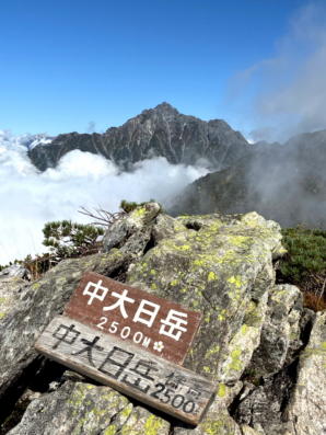 次の中大日岳へ。高度感ある滑りやすい岩場の下降、荒れた崩壊地、長いハシゴ等を経て再び尾根をたどると中大日岳に。