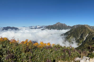 受付を済ませ大日岳へ。剱岳から立山三山、浄土山、薬師岳、360℃の山々が雲海の上に浮かんでいる景色を堪能し大満足。