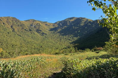 大河原峠から双子山はほんのひと登り。山頂の展望を楽しんで双子池へ下る。深い笹の道だ。