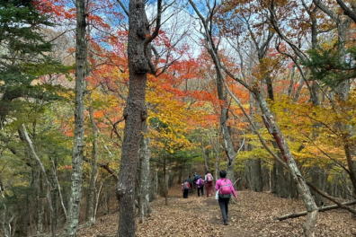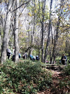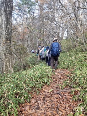 登り始めは少し岩ごろだがすぐに樹林帯の緩やかな道になり、秋を満喫しながらクマザサが生い茂るジグザグを抜けると木の間から鼻曲山も姿を見せた。