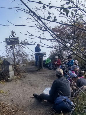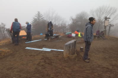 頂上では大きく見られるはずの富士山も全くだめで残念無念。昼食・集合写真の後、下山開始。
