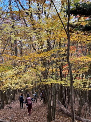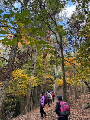 途中のミネ山でアンパンタイムと水補給。ここから先、色づいた樹々が増えてきた。黄色や橙色の葉が混ざり合いそのグラデーションが、明るい日差しを受けると更に素晴らしい!