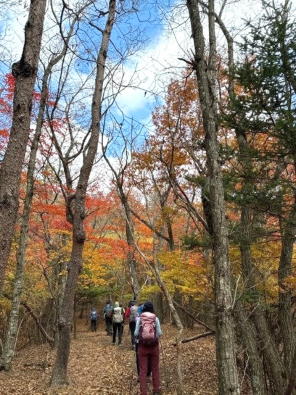 山々の紅葉が時折差す日差しに照り輝き、鮮やかに見える中、皆さんの協力で穏やかな山行ができました。