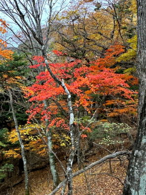 平らな開けた場所では、日差しを受けて、赤い葉・黄色い葉がまぶしくきれいだ。