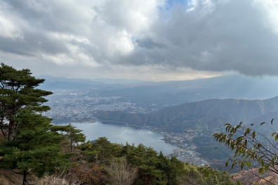 山頂直下のつづら折り付近で明るくなり、河口湖や西湖が眼下にはっきり望め、さざ波がまぶしく光ってきれいだ。
