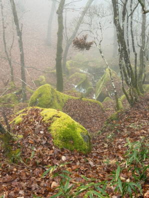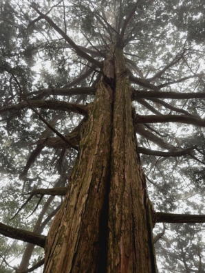 柳沢峠駐車場から、まずは鈴庫山を目指す。霧雨、風景は水墨画の幻想的な世界。だがそのお陰か、苔の濃い緑が美しい。